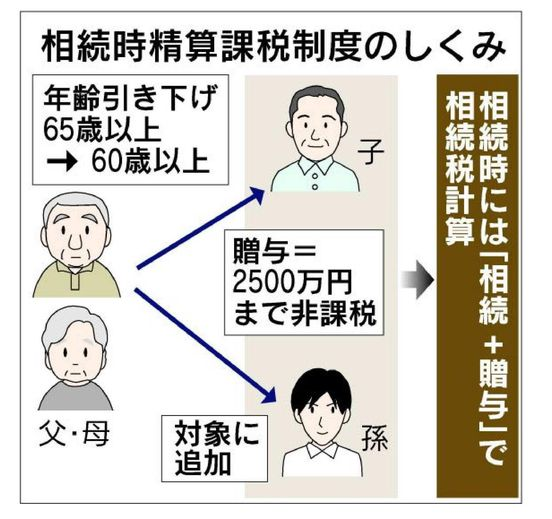 現在はこの制度を利用すれば、子への贈与については1人あたり2500万円までが非課税となる。この対象に孫を加える。20歳以上の子と孫が恩恵を受けられるようになる。